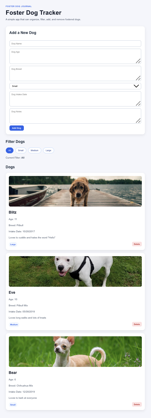A React application that allows users to track foster dogs by storing information such as name, breed, age, intake date, notes, and photos. The application supports adding and removing dog records, filtering dogs by size, and persists data using browser localStorage.