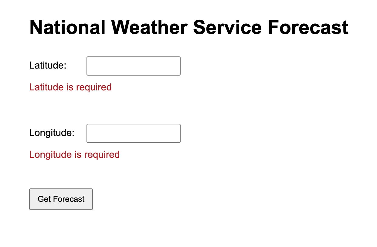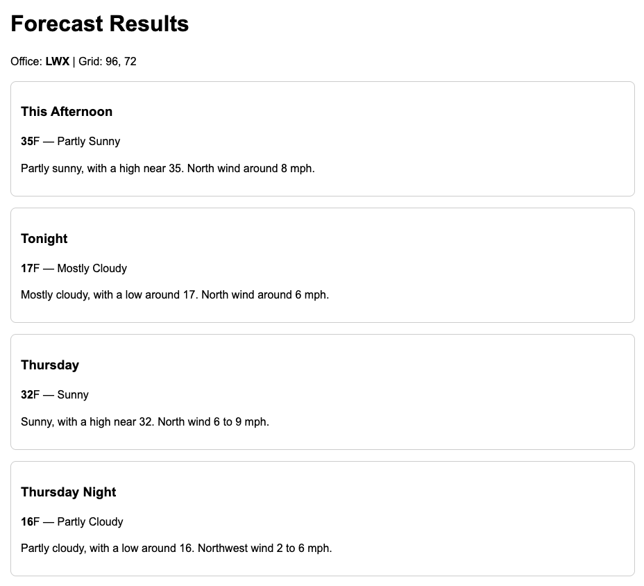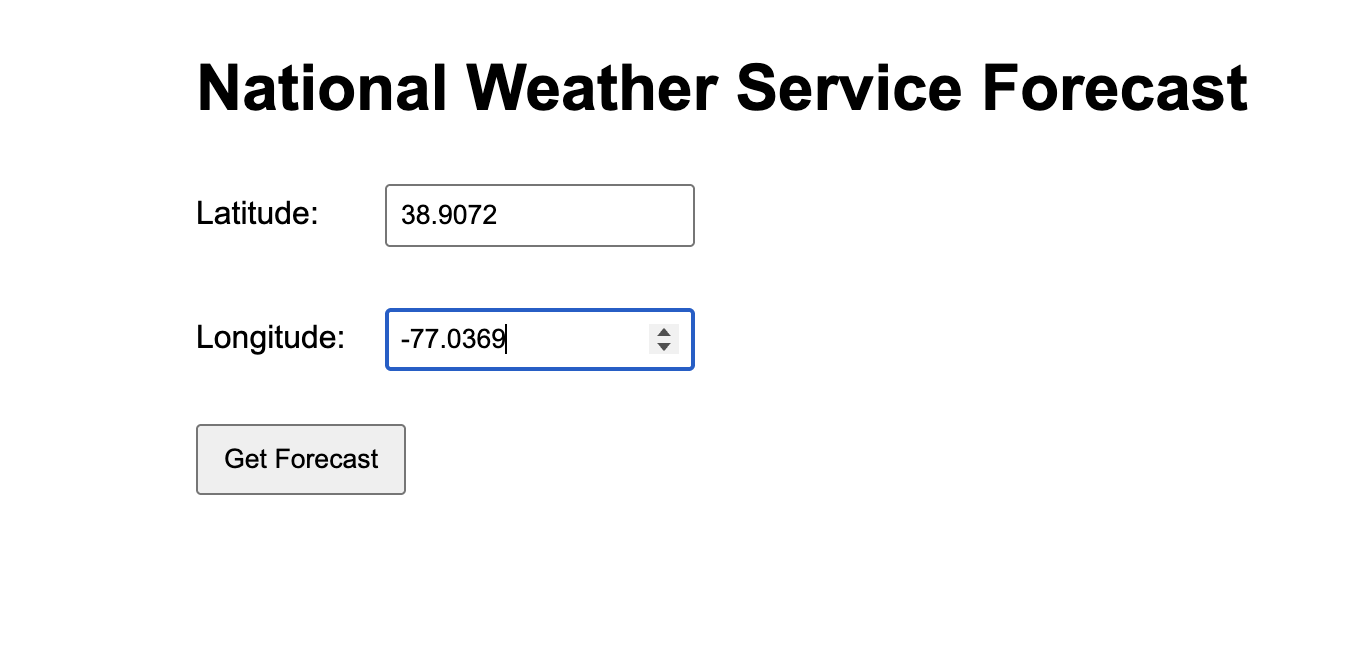 A Spring MVC web application that retrieves and displays real-time weather forecasts by integrating with the National Weather Service API using user-provided geographic coordinates.